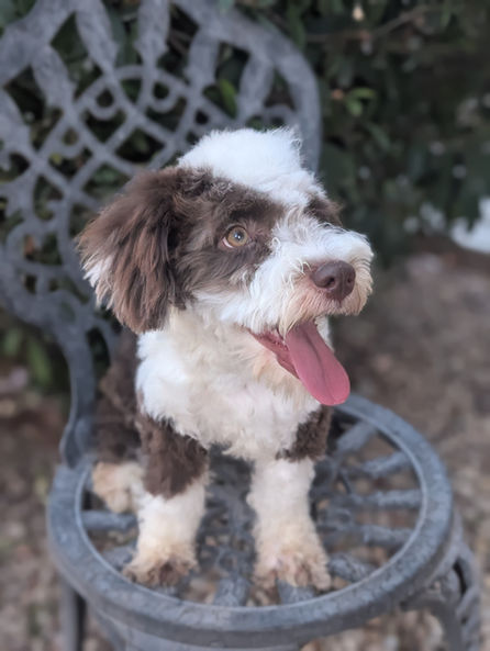 Bruno is an AKC Registered toy poodle, born in 2023. He weighs 7 pounds and has the cutest personality. His coat is parti chocolate with abstract back markings. He loves his daddy and spends lots of time with his "doggy cousins" Meatball and Rudy.